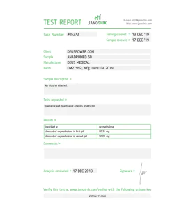 Product Features ACTIVE HALF-LIFE 8 HOURS CLASSIFICATION ANABOLIC STEROID DOSAGE MEN 50-100 MG/DAY ACNE YES WATER RETENTION HIGH HBR YES HEPATOTOXICITY YES AROMATIZATION NO MANUFACTURER Deus Medical LAB TEST See Document SUBSTANCE OXYMETHOLONE